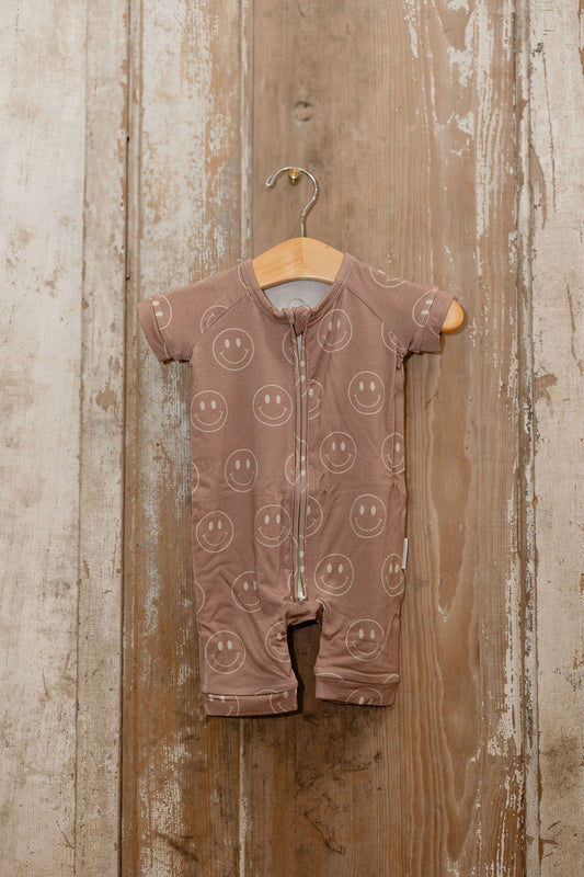 Regular price $36.00Regular priceUnit price / perSale price $36.00brown happy face short bamboo romper • ivory soul exclusive