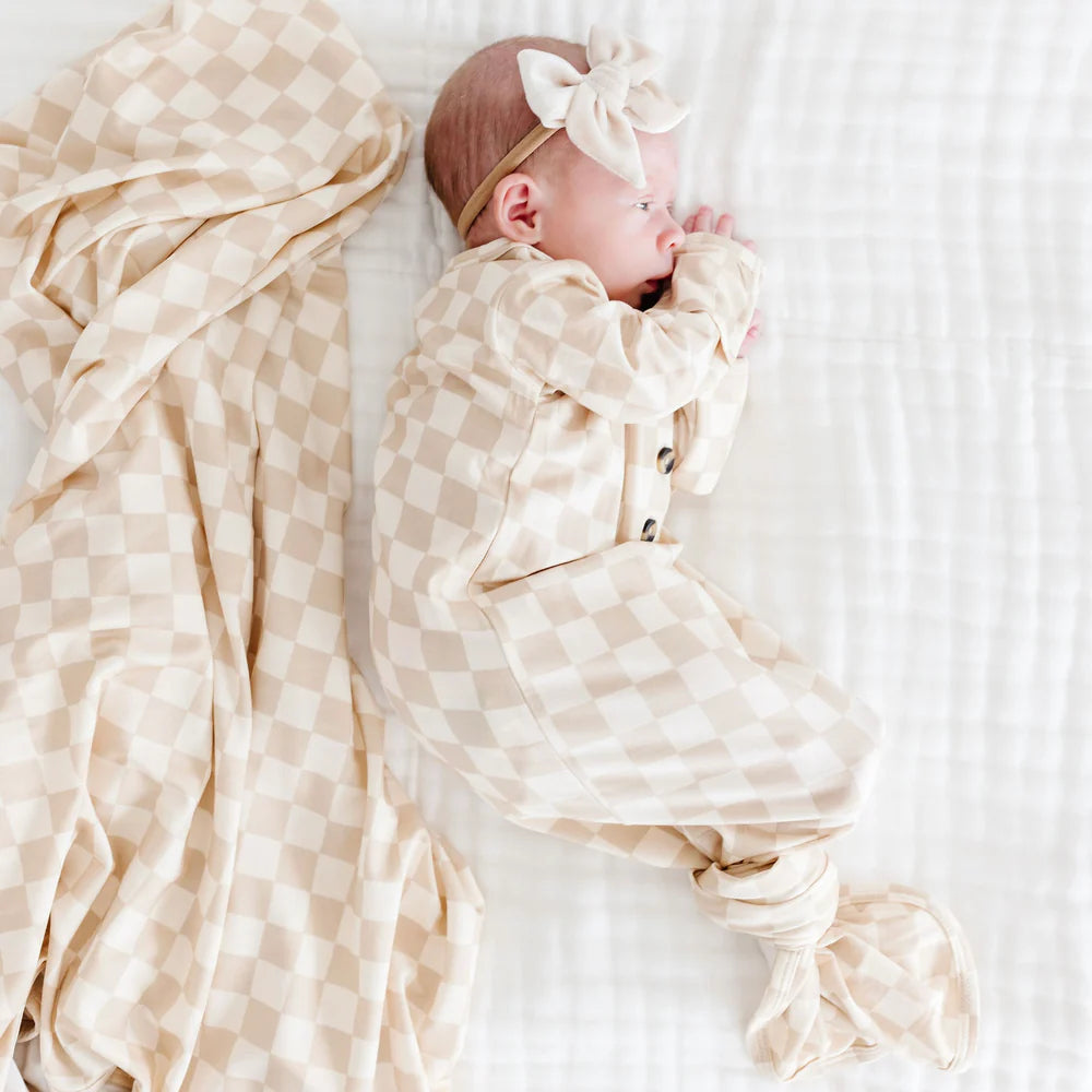 The easiest tie-bottom outfit for day or night. Made for hassle free diaper changes and gentle dressing, I designed this with a button-down front and tie bottom for simple closure (no more snaps at 2am!). Fold over wrist cuffs are the most thoughtful finishing touch.