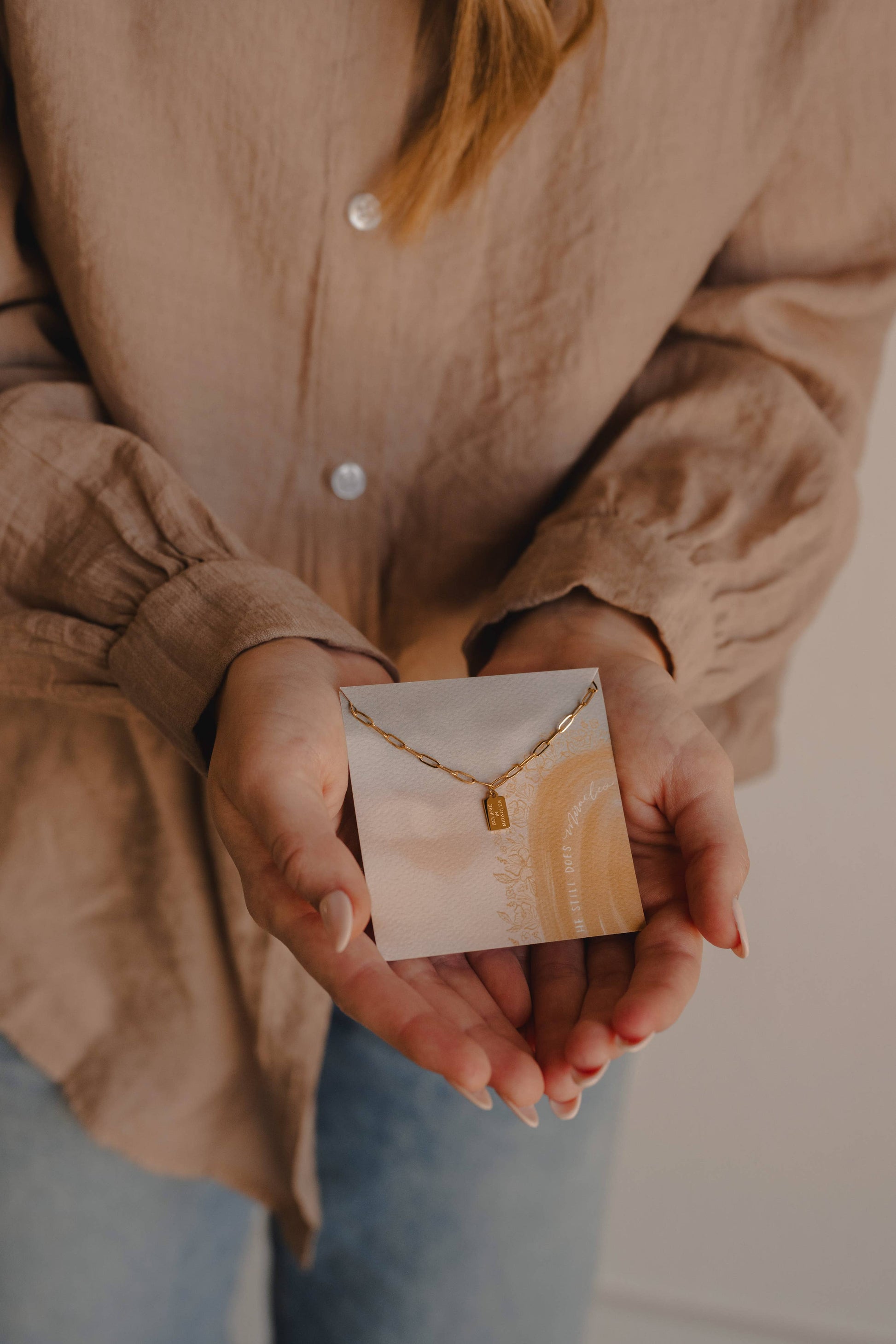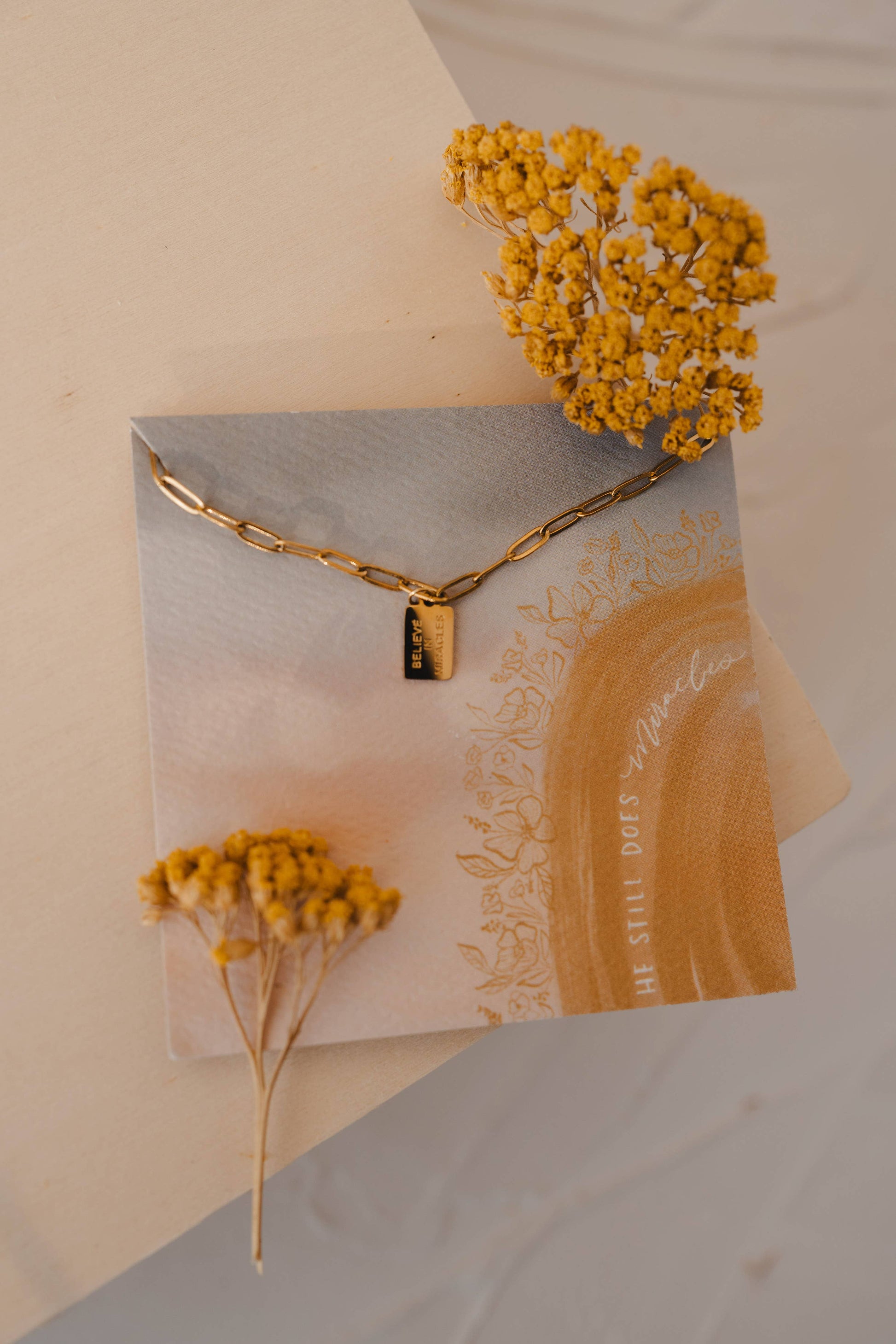 Displayed on a textured card featuring beautiful artwork by Lauren Ferguson of The Golden Designs. Full verse reference included on the back of the card.