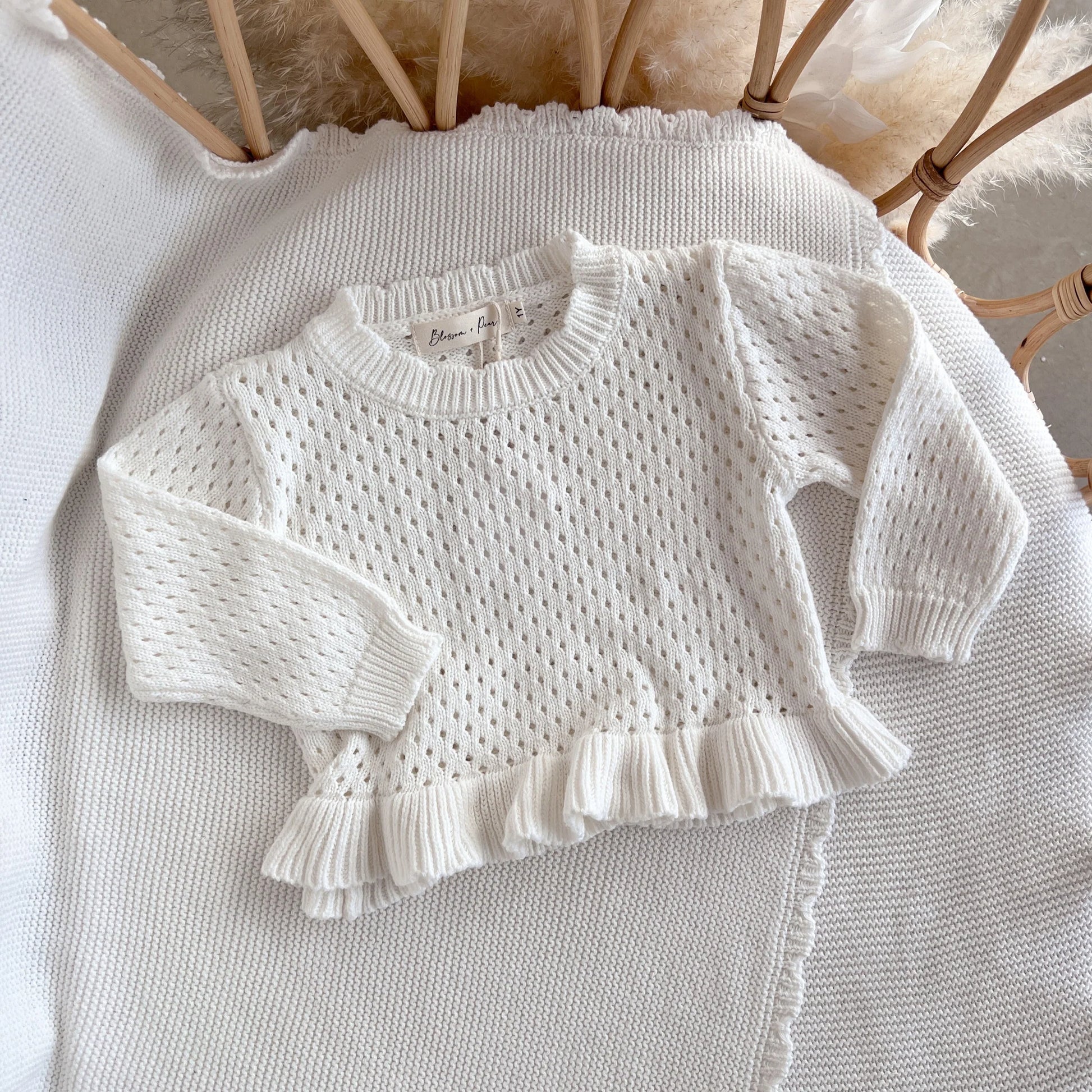 crochet long sleeve frill top - milk