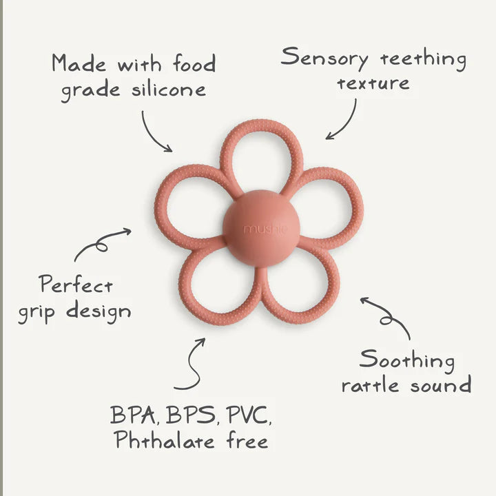 Inspired by nature and designed with functionality and comfort in mind, our silicone Daisy Rattle Teether features a playful flower shape and built-in rattle. The cheerful sound engages baby’s auditory senses for added soothing relief. With handles that are easy for small hands to grasp and a textured silicone surface that massages gums, our rattle teethers are perfect for your little one’s teething journey. Made from 100% non-toxic, BPA free, food-grade silicone.