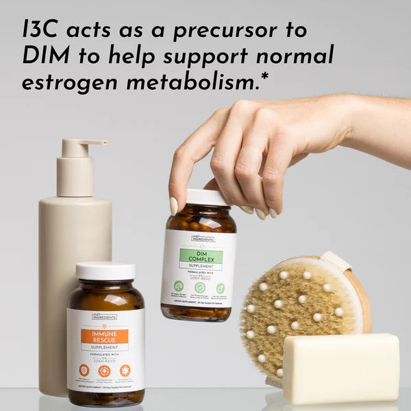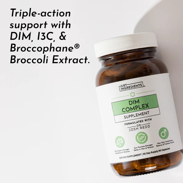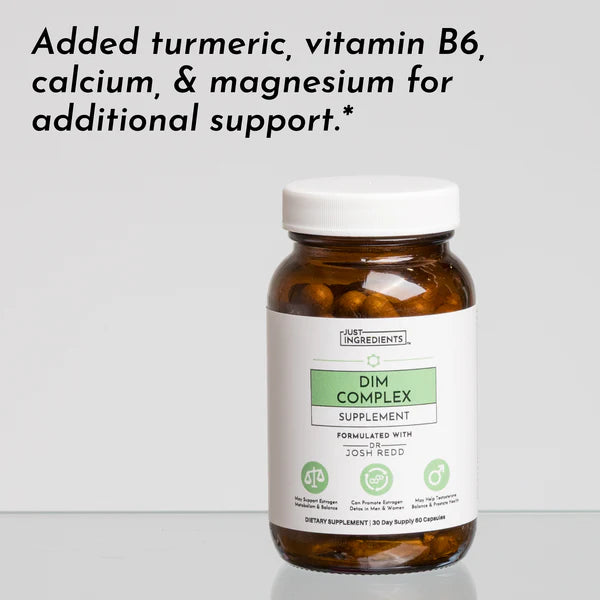 Just Ingredients’ DIM Complex combines DIM, I3C, and broccoli extract to support normal estrogen metabolism for both men and women. I3C (Indole-3-Carbinol), found in cruciferous vegetables, acts as a precursor to DIM, supporting normal hormone metabolism.* DIM (Diindolylmethane) is a plant compound studied for its role in contributing to overall hormonal wellness. Broccophane® Broccoli Sprout Extract contains glucoraphanin and sulforaphane, which support liver detox pathways.* Plus, we’ve added turmeric, Bioperine® black pepper, vitamin B6, calcium, and magnesium for added support.