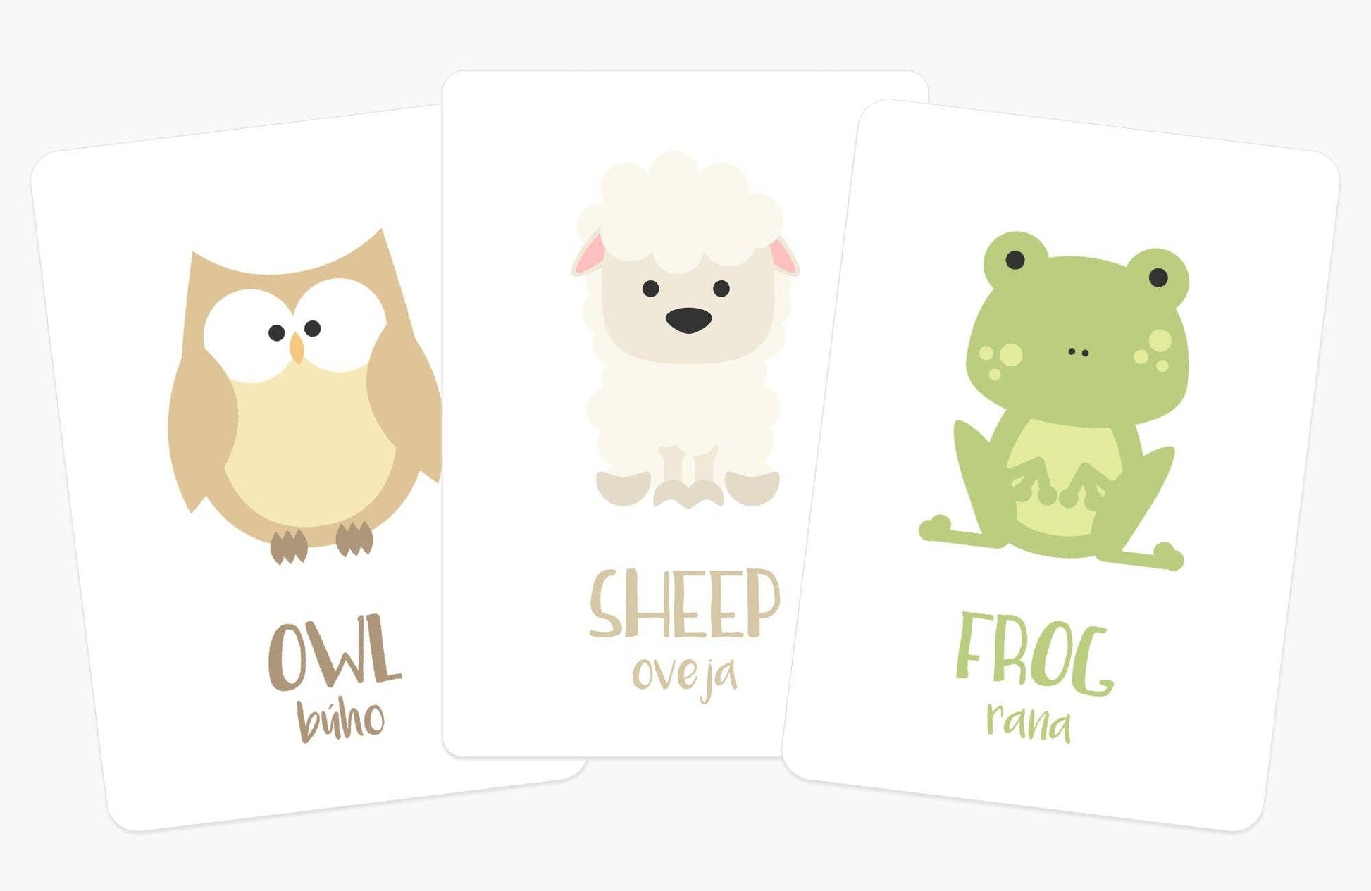 Set includes 10 Farm Animal Flashcards: - Cat "Gato" - Horse "Caballo" - Pig "Cerdo" - Rabbit "Conejo" - Duck "Pato" - Goat "Cabra" - Owl "Buho" - Sheep "Oveja" - Frog "Rana" - Cow "Vaca" Ask me about other animals sets and languages or request a custom order!