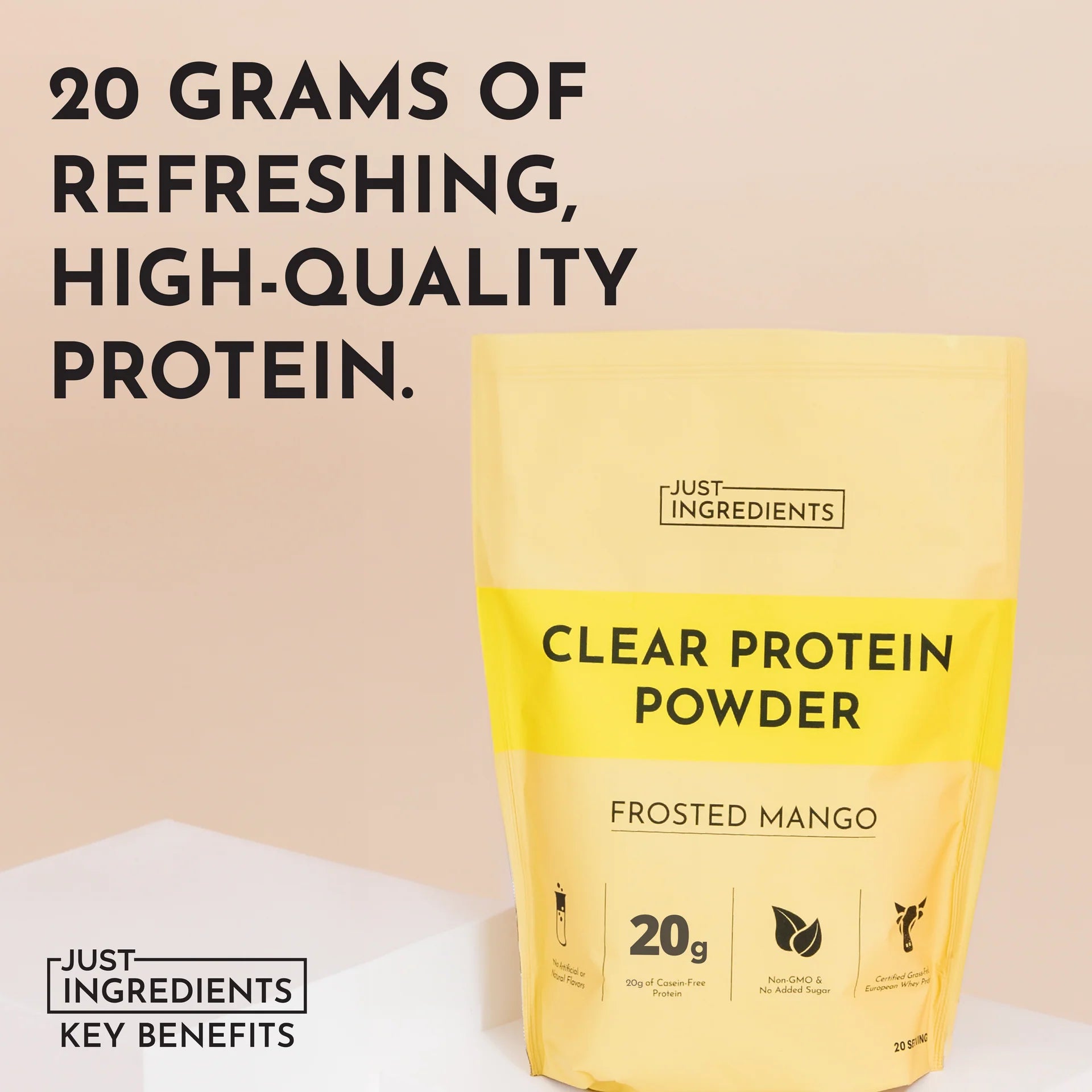Light, smooth protein made with real fruit. Just Ingredients Frosted Mango Clear Protein Powder is a new take on your protein routine. Each serving delivers 21g of high-quality whey protein from grass-fed cows, and it's casein-free to support easier digestion. It’s flavored with organic mango and peach—no natural or artificial flavors, added sugar, or artificial sweeteners. Simple ingredients. Seriously refreshing.
