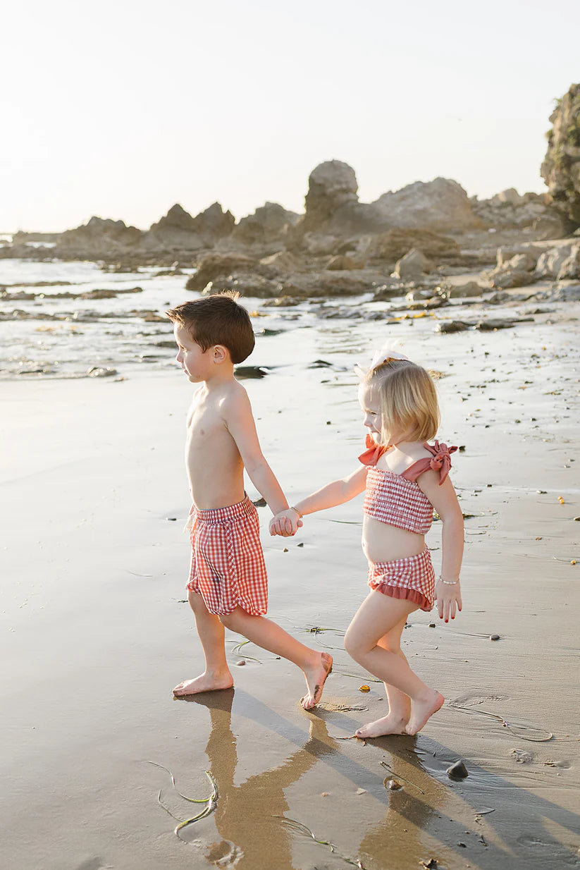 The top features adjustable shoulder ties for a comfortable fit and the sweetest bow details, while ruffles at the leg openings add an extra touch of playful charm. Made with lightweight, quick-drying fabric, it’s designed to move with them through every swim, splash, and sandy moment.