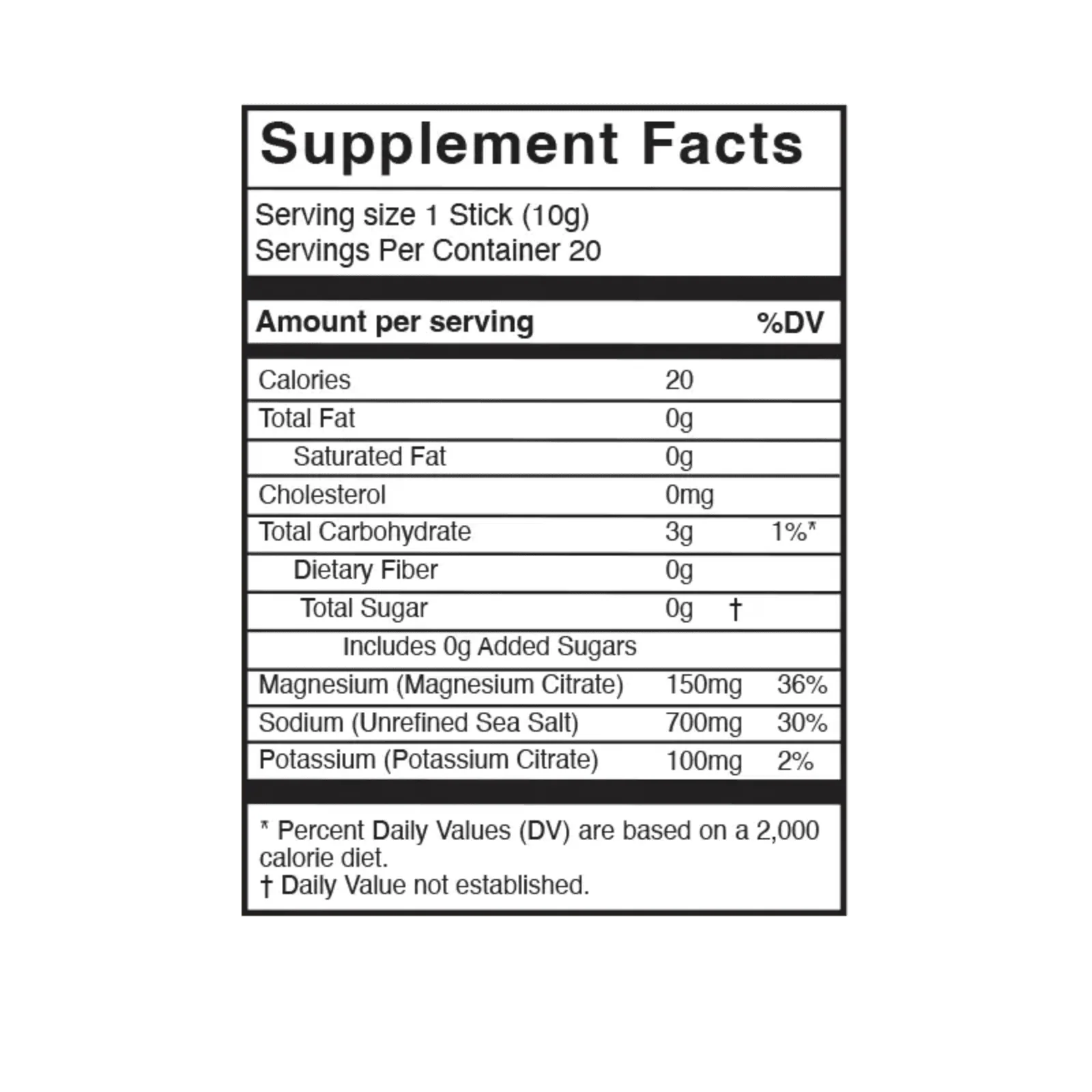 Ingredients: Organic guava powder, organic coconut water powder, citric acid (from cassava root), grapefruit extract, organic stevia leaf extract. Each individual stick contains 700 mg of sodium (unrefined sea salt), 150 mg of magnesium (magnesium citrate), and 100 mg of potassium (potassium citrate).