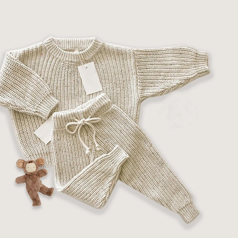 stay cozy with this stylish knit baby sweater and pants set. Super soft and perfect for chilly days, the pieces can be worn together or separately. this set is a must-have for any baby's wardrobe.