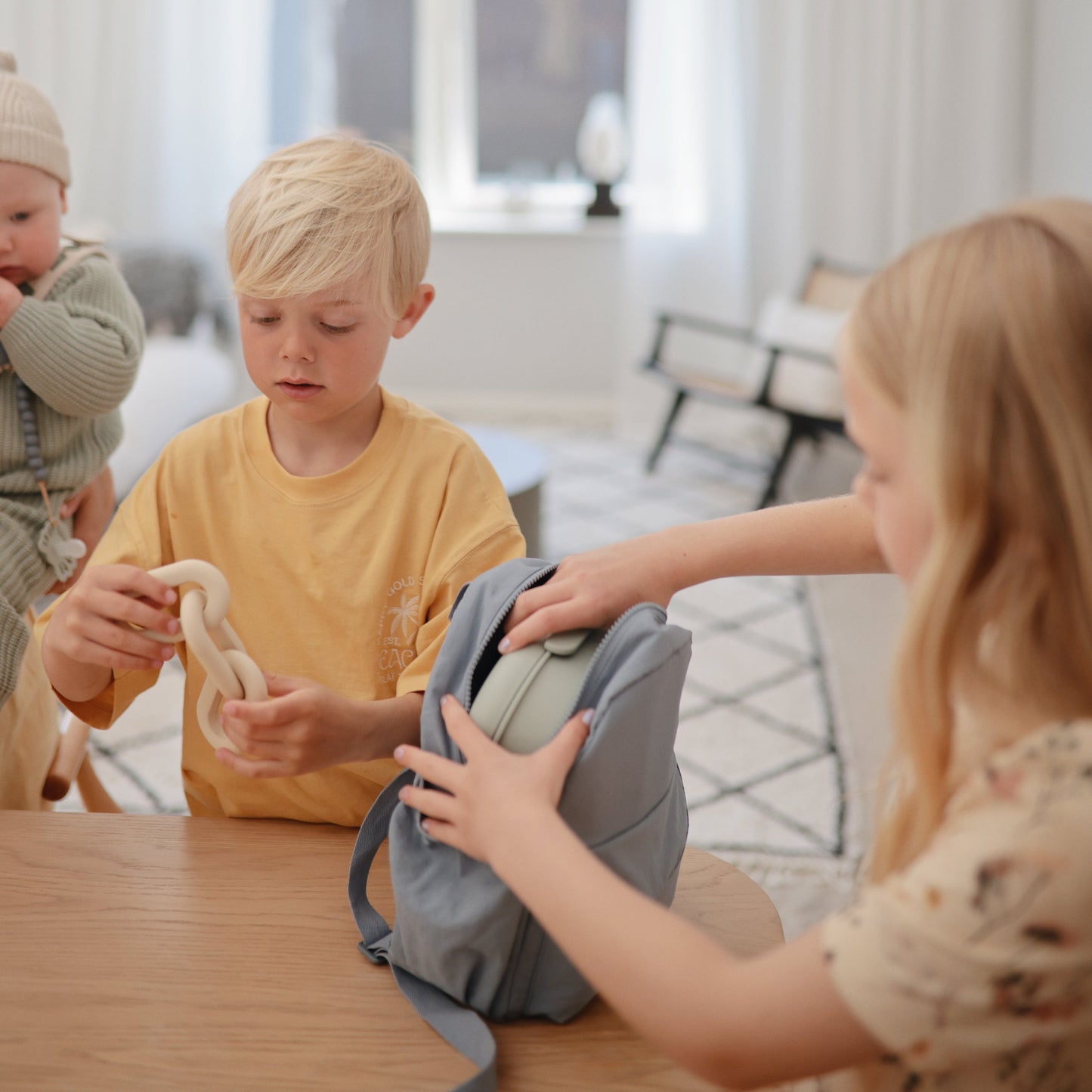 Offer comfort and relief with a teether designed to soothe sore gums throughout the entire teething journey. Made from 100% food-grade silicone, our teether is easily held by tiny hands. With three connecting links that mirror modern design aesthetics, parents can maintain their personal style while littles enjoy a practical and playful toy.