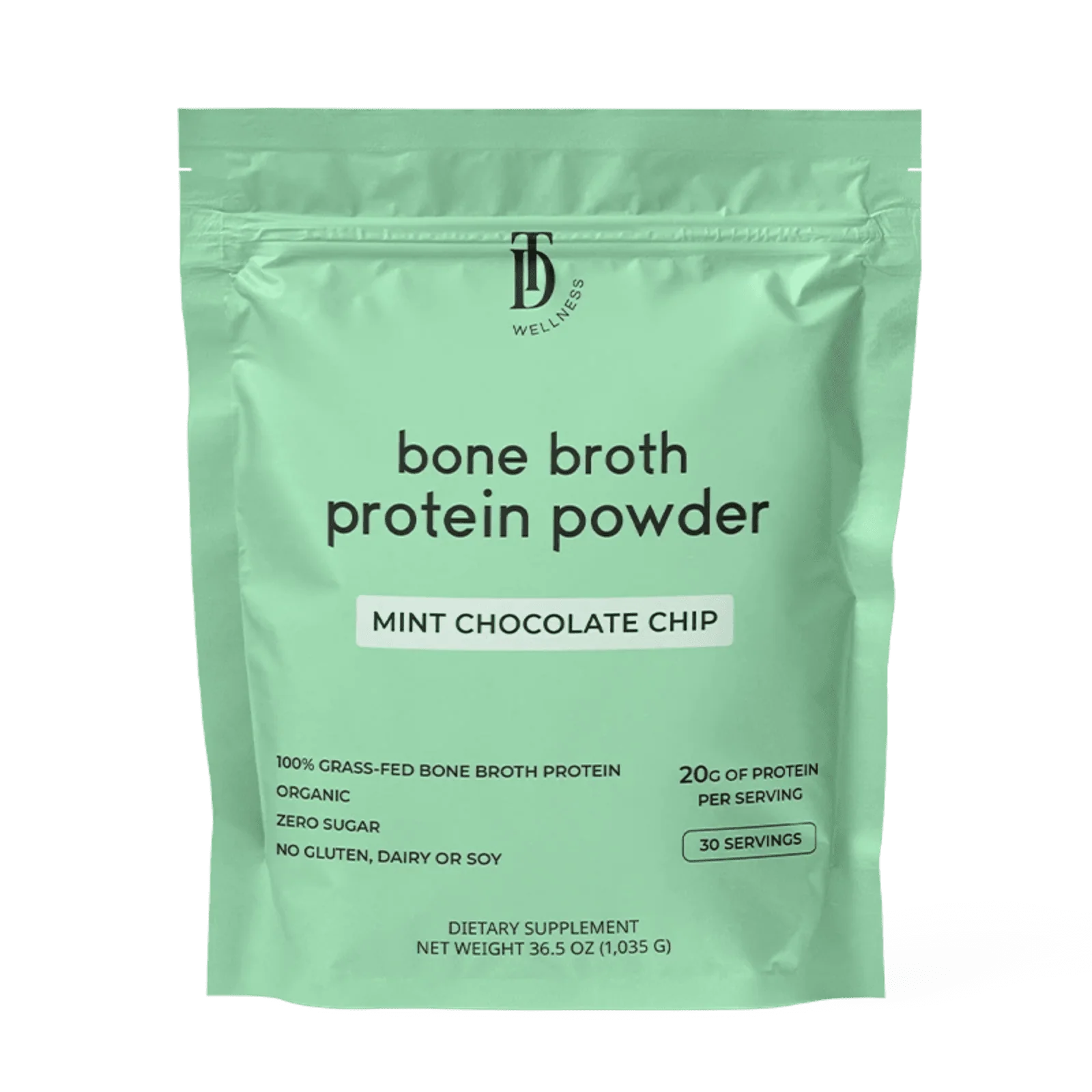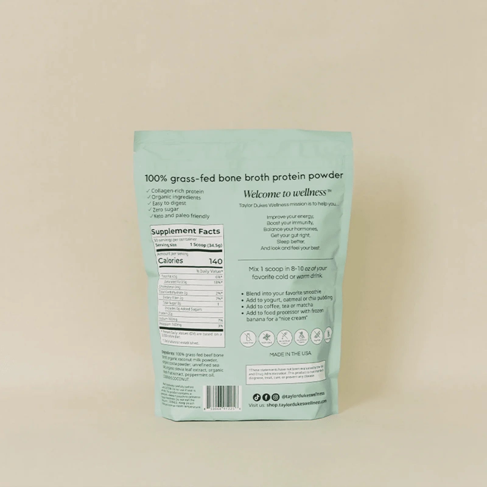 Enjoy the indulgent taste of mint chocolate chip with none of the dairy, added sugar, or artificial ingredients. Taylor Dukes Wellness Bone Broth Protein is made from 100% grass-fed bone broth and real food ingredients you can trust.