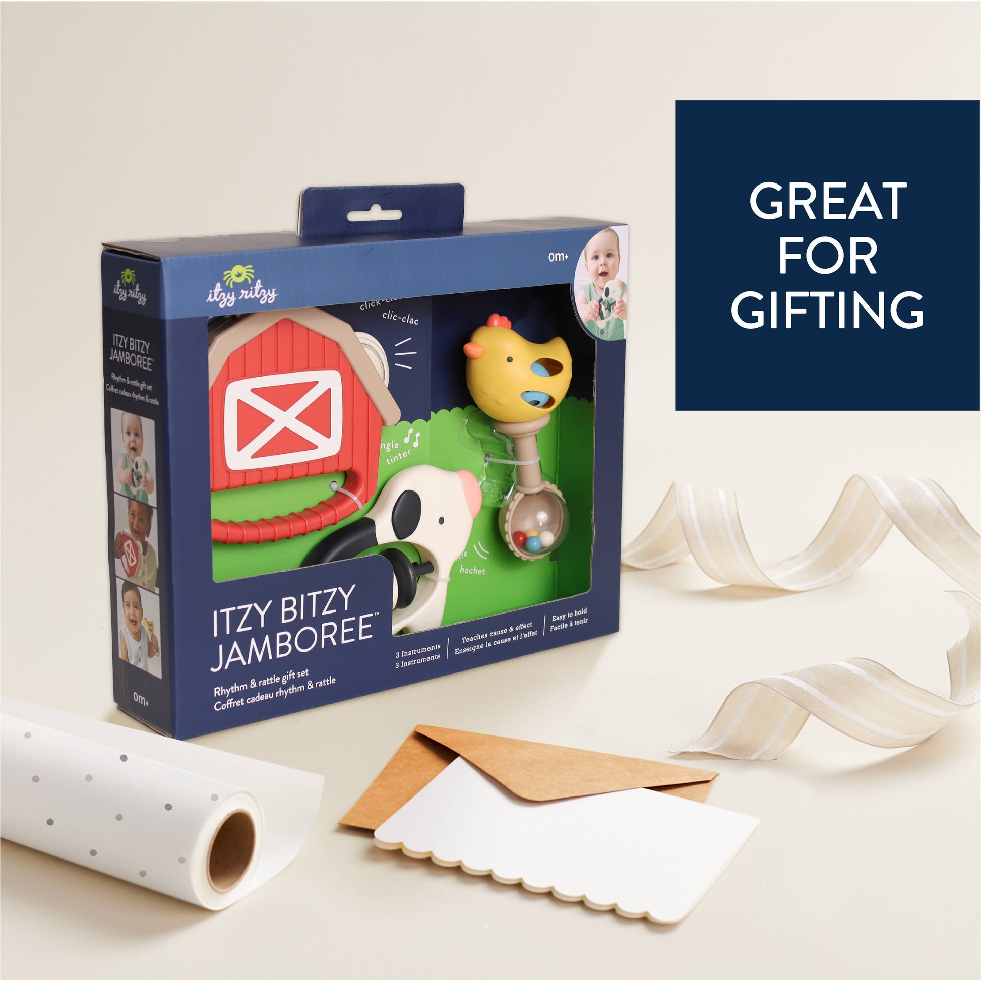 Make some music! Rock baby’s world with the Itzy Bitzy Jamboree music set. Designed for little hands to hold, this toe-tapping trio features a tambourine, jingle maraca, and shaker toy with clacker beads for an all-out sensory jam sesh.