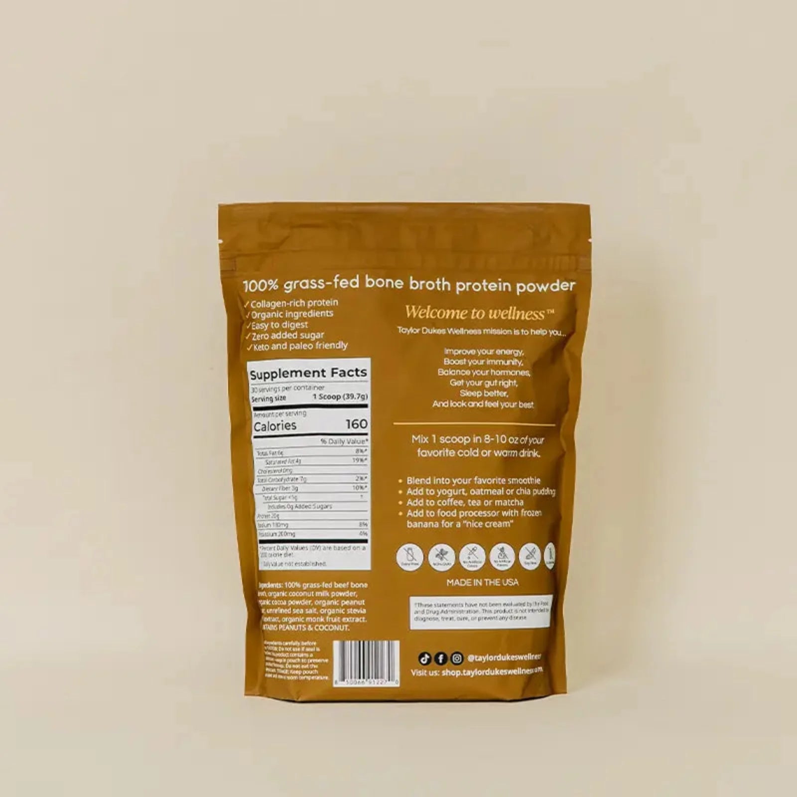Enjoy the creamy taste of peanut butter and chocolate with none of the dairy, added sugar, or artificial ingredients. Taylor Dukes Wellness Bone Broth Protein is made from 100% grass-fed bone broth and real food ingredients you can trust.