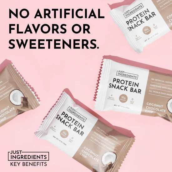 A protein snack bar made with real food. The Coconut Chocolate Chip Protein Snack Bar is made with ingredients like coconut, dates, peanut butter, and honey. With 10g of protein from grass-fed whey, pea, pumpkin seed, and chia seed protein. No seed oils, artificial preservatives, and natural or artificial flavors—just simple ingredients you can feel good about snacking on.