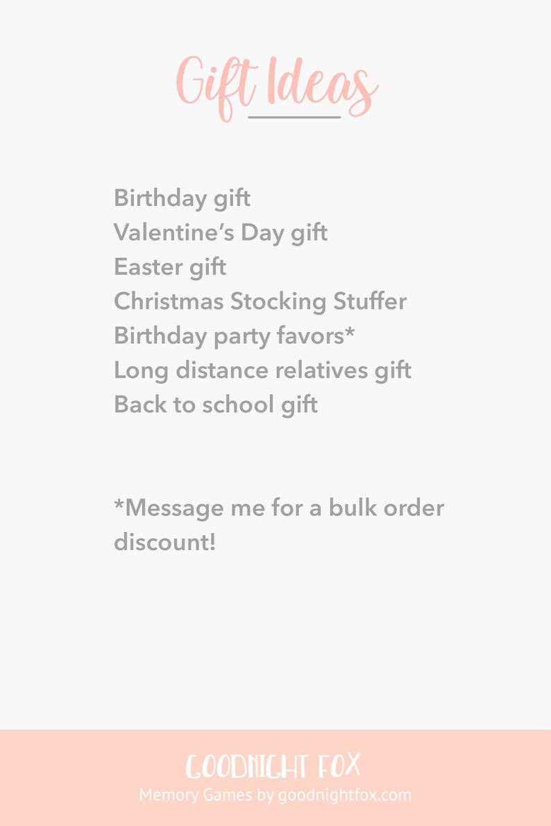 Looking for the perfect educational gift for your little ones? This little match game is perfect! Challenge your memory with this fun set of animal memory game cards. It's fun for preschoolers of all ages and ideal for ages 1 to 6. Cards are 2.56" x 2.56" and printed on coated card stock to stand up to toddler slobbers. They arrive in a durable linen burlap bag for safe keeping and are great on the go (think picnic in the park, long road trip activity, etc.)