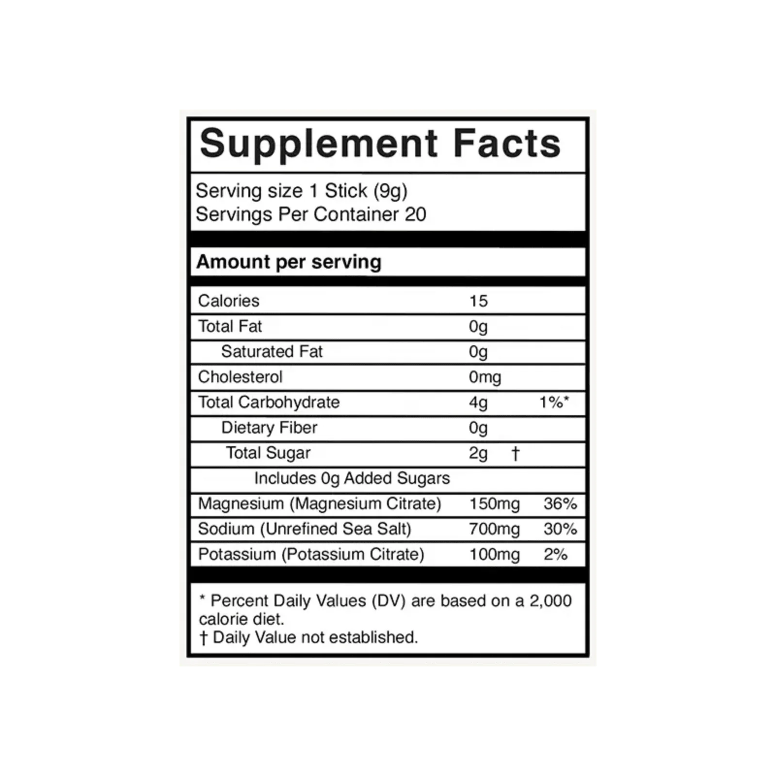 Ingredients: Organic strawberry powder, organic coconut water powder, citric acid (from cassava root), lemon extract, organic stevia leaf extract. Each individual stick contains 700 mg of sodium (unrefined sea salt), 150 mg of magnesium (magnesium citrate), and 100 mg of potassium (potassium citrate).